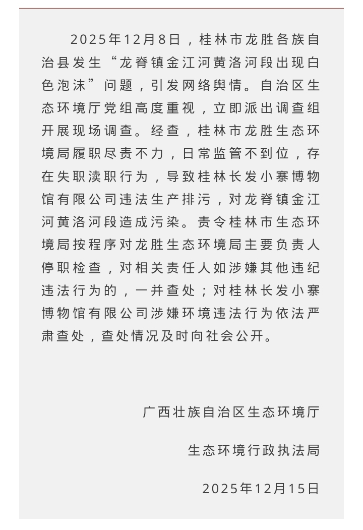 事件引发网络舆情后,自治区生态环境厅党组高度重视,立即派出调查组赴现场核查。经查,桂林市长发小寨生物科技有限公司涉嫌违法排污。同时,龙胜生态环境局履职尽责不力,日常监管缺位,存在失职渎职行为,未能及时发现并制止企业违法行为,致使河流遭受污染。