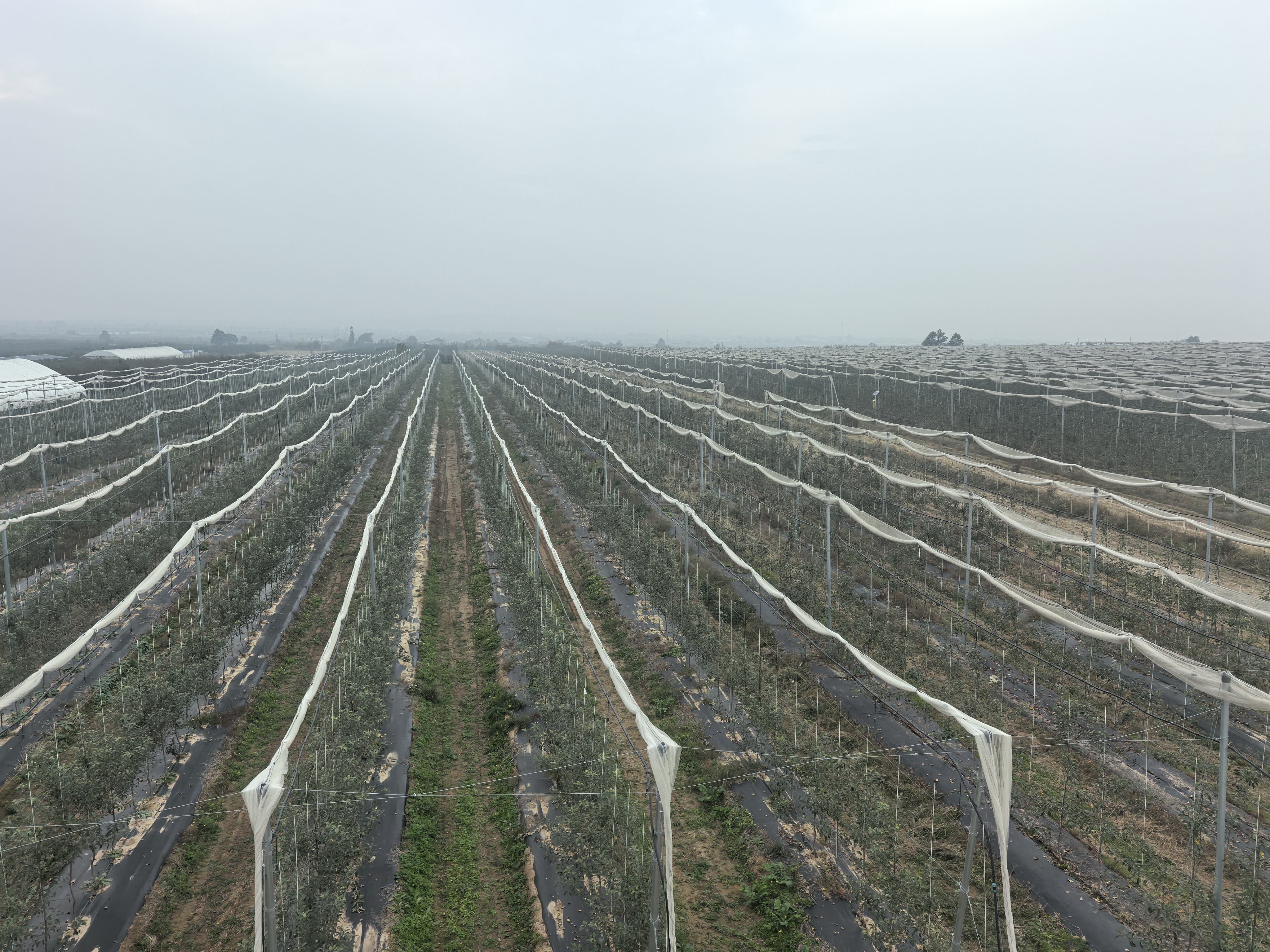 在耽子镇东屯村,一座占地1000亩的“郇阳果园”千亩苹果示范基地是临猗探索产业升级的最新成果。基地内,水泥柱与钢丝绳搭建起标准的支撑体系,宽行密植的果树排列得挺拔整齐,地面上铺设着水肥一体化管道,空中架设着防雹网。站在高处俯瞰,整个基地的整齐程度堪比军队方阵,尽显现代化农业的规整与高效。