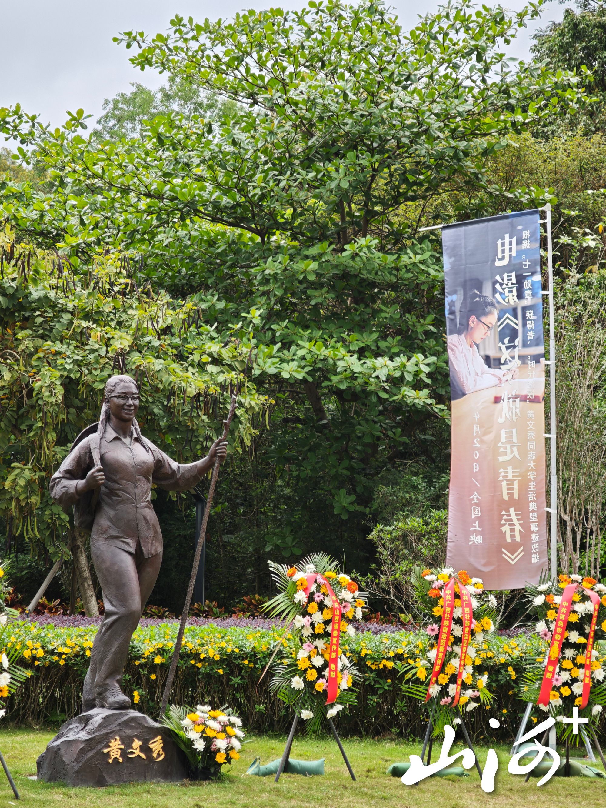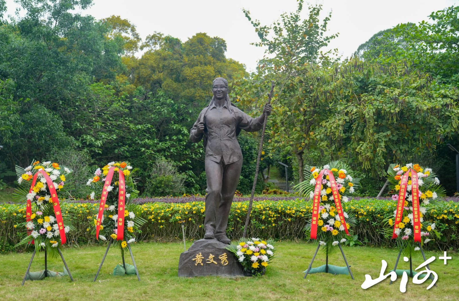 北京师范大学珠海校区文秀广场上,黄文秀的雕像沐浴在朝阳中:她头戴草帽、身背书包、手拄树枝、面带微笑,正迈步向前——这个定格了“时代楷模”最美姿态的塑像前,鲜花簇拥,人群肃立。
