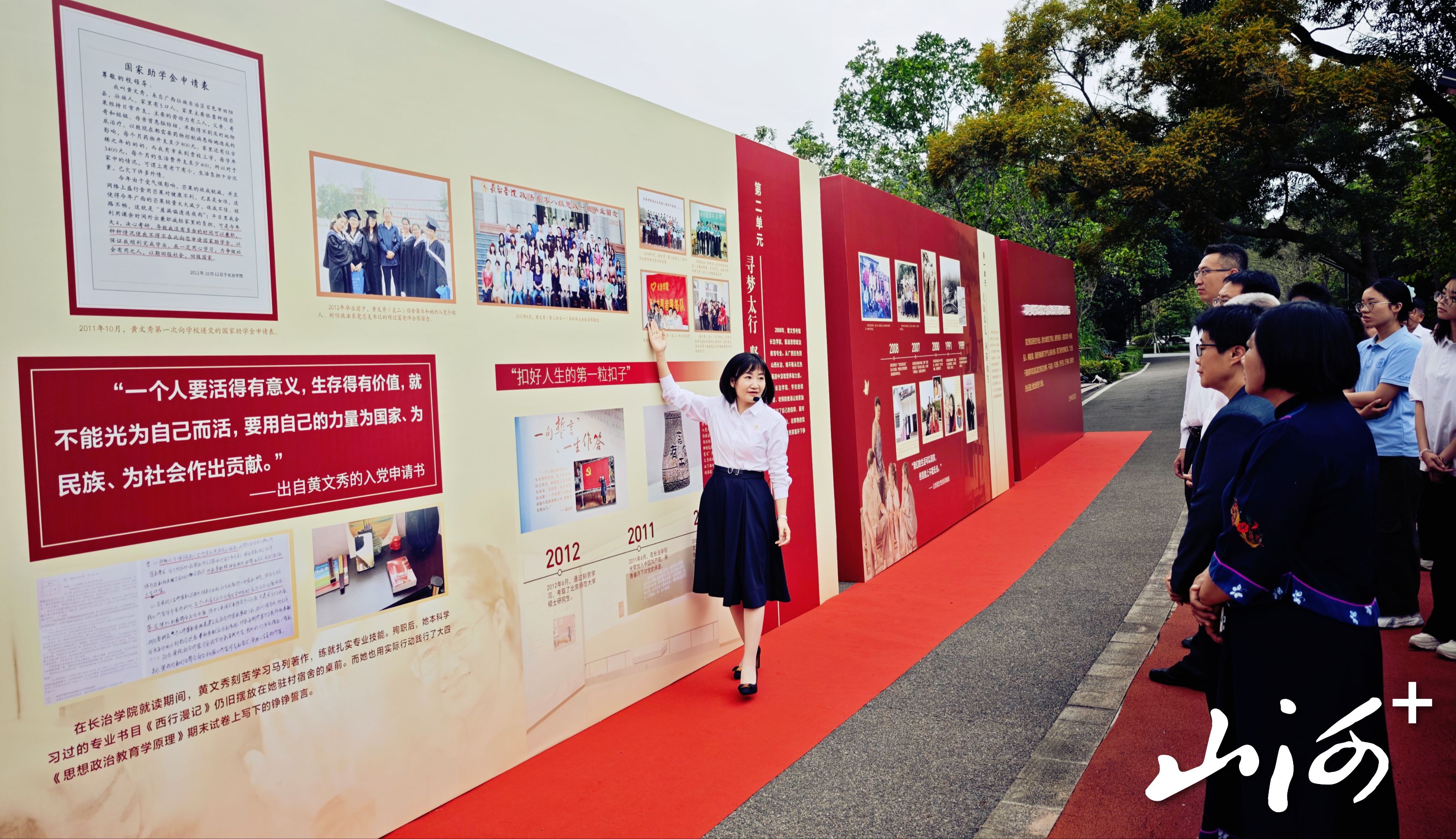黄文秀是长治学院与北京师范大学接续培养的优秀青年。这份特殊的校际联结,让此次活动成为两校共传榜样力量、共促思政育人的有益尝试。在讲解员的引领下,参观者驻足于黄文秀事迹展板前,重温她从革命老区百色到太行山脚下求学、从青涩学子成长为优秀共产党员的精神蜕变轨迹。塑像前,人们敬献鲜花、深深鞠躬,表达无限追思。