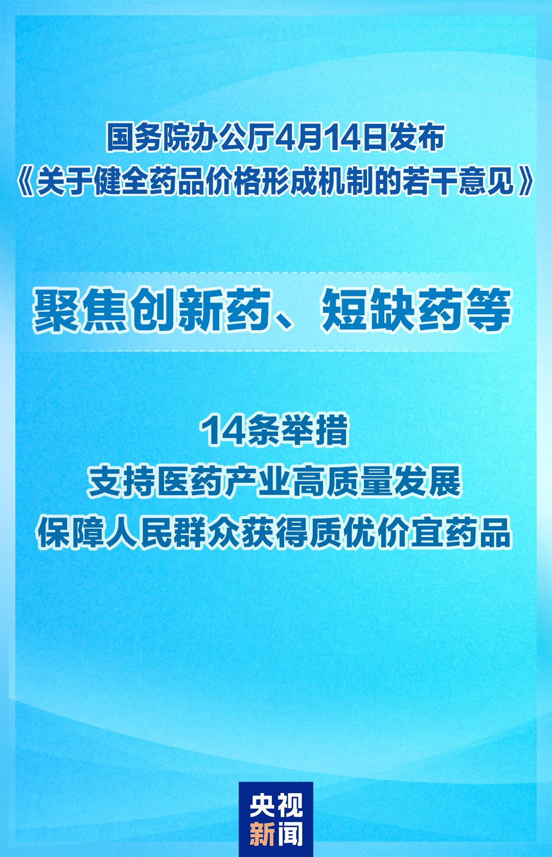 国务院办公厅4月14日发布《关于健全药品价格形成机制的若干意见》,提出14条举措,包括优化创新药等新上市药品首发价格机制、发挥医保支付标准对药品价格形成的引导作用、引导药店合理制定药品零售价格、强化短缺药保供稳价等。