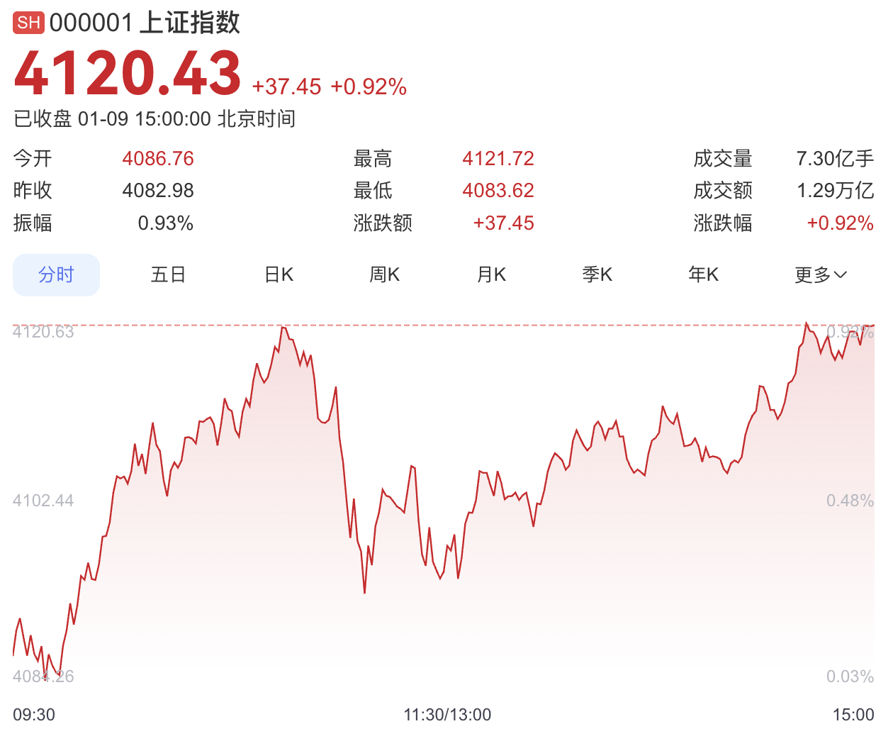 今天(1月9日),A股三大指数集体上涨,截至收盘,上证指数涨0.92%站上4100点,深证成指涨1.15%,创业板指涨0.77%;北证50涨1.05%。