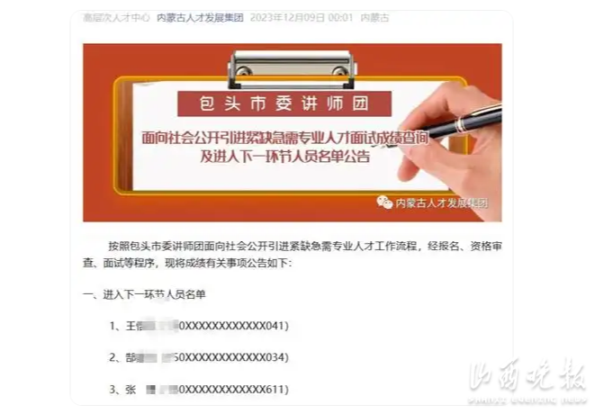 此前,有网友指出,包头市委讲师团在2023年12月曾开展一轮面向社会公开引进高层次和紧缺急需专业人才的工作,该轮引进因遭受举报而被迫中止。然而,令人意外的是,2025年1月,该单位重新启动了相同的人才引进计划。在2月份发布的面试通过公示名单中,3名考生的姓名竟与去年因举报而中止面试时的入围考生姓名完全一致。此举引发了公众对于内蒙古自治区包头市委讲师团在2025年1月进行的高层次和紧缺急需专业人才招考过程中是否存在违规操作的强烈质疑。