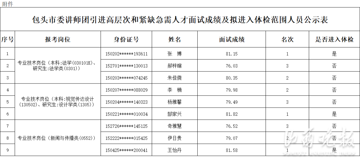 内蒙古人才发展集团有限公司官方微信账号于2023年12月发布了《关于包头市委讲师团面向社会公开引进紧缺急需专业人才面试成绩查询及进入下一环节人员名单公告》,名单显示王某丹、郜某兴、张某3人进入下一环节。
