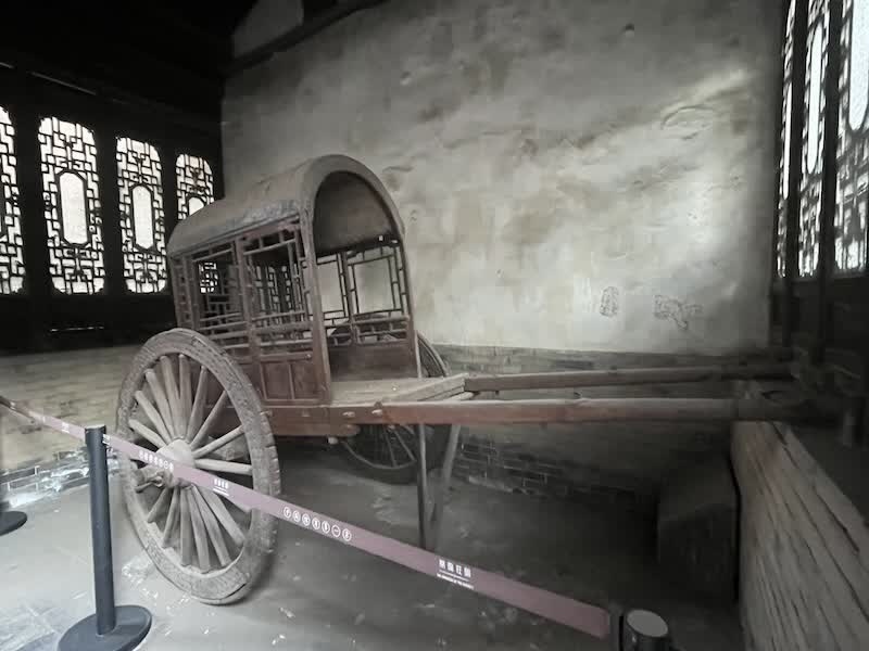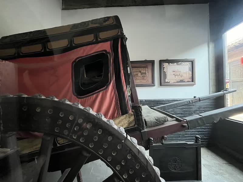 在乔家大院内部则可以看到一辆乾隆年间的马车,上有红布。工作人员告诉记者,“大院里原有马车11辆,现存仅一辆。大家族坐车讲究男蓝女红,红布是代表女眷乘坐。这辆车比例并不协调,轿身较小,轮子很大。这是因为轿子大小是有制度规定的,而乔家为了彰显财富,只能把轮子做大。马车的车轴是用小叶紫檀木雕刻而成的,非常豪华。”