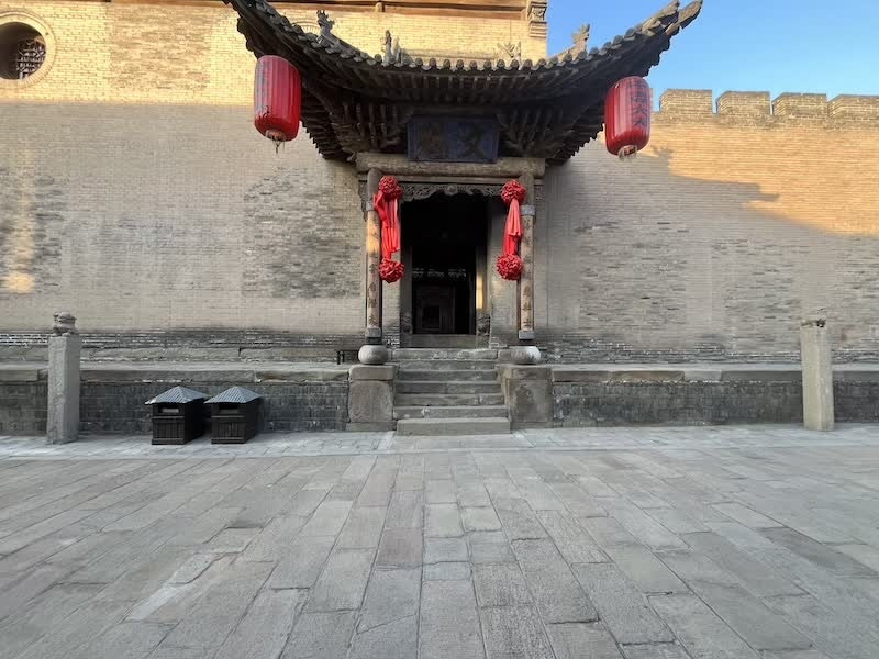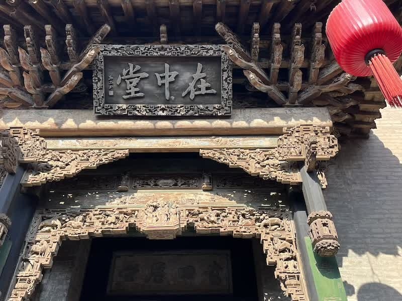 进入乔家大院大门是一条长80米的石铺甬道,把六个大院分为南北两排,西尽头处是乔家祠堂,与大门遥相对应。在大门处,人们可以看到拴马桩和上马石。张素英说,“这里的拴马桩是乔家临时拴马用的。每个院落门前没有门槛,石路平铺,也是方便马车进出。在过去,乔家门口还有个专门养马的车马院。”