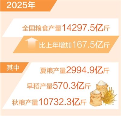 国家统计局12月12日发布数据显示,2025年全国粮食产量14297.5亿斤,较上年增加167.5亿斤,增长1.2%,稳定在1.4万亿斤以上,再次实现高位增产。