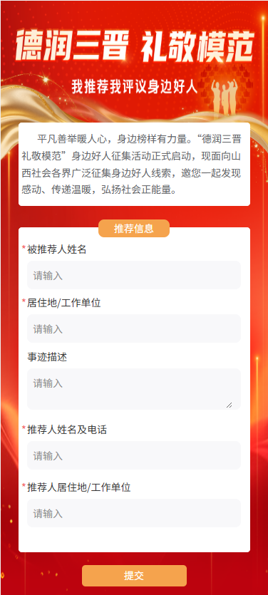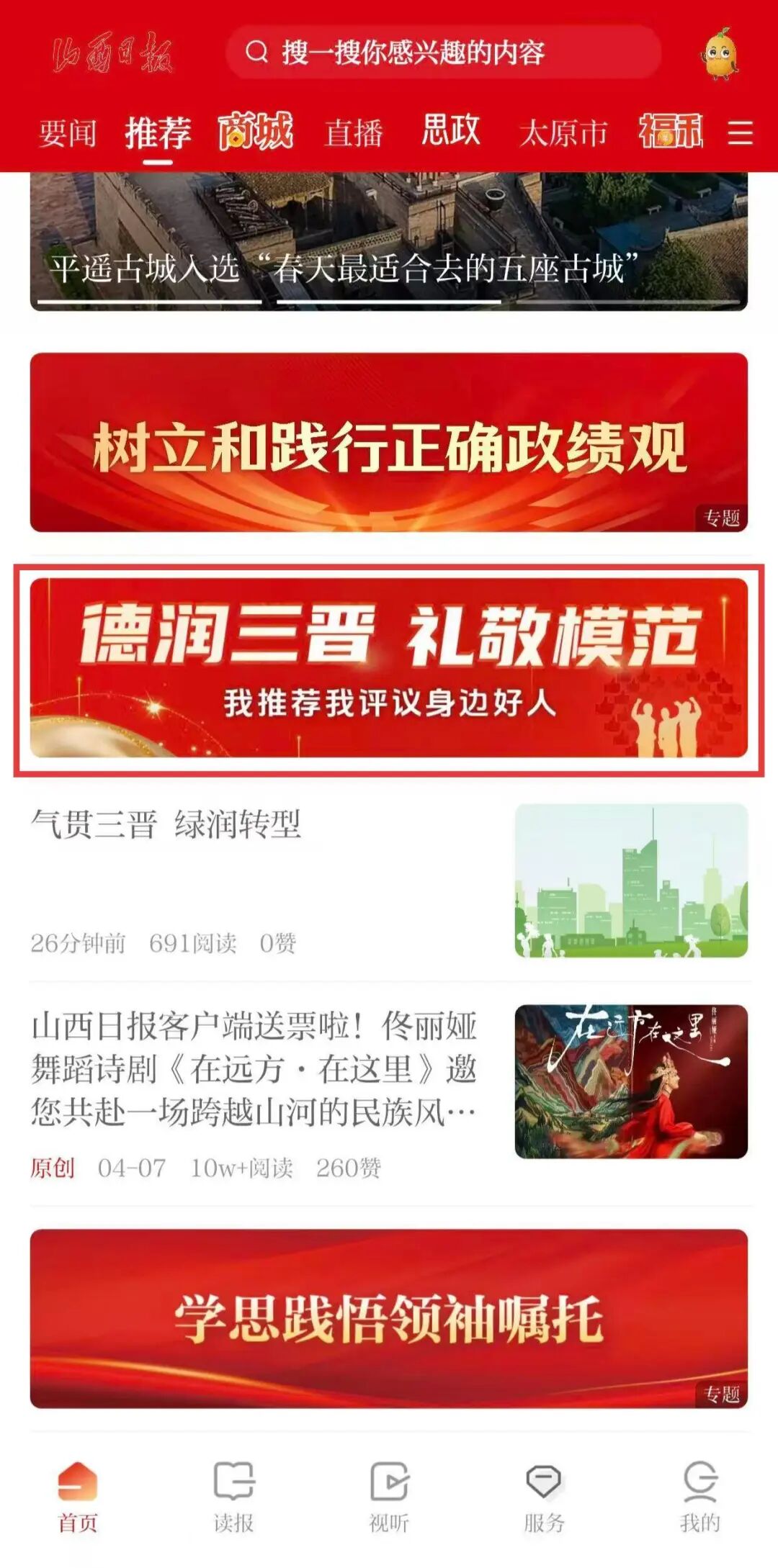 下载山西日报客户端,打开主页进入“德润三晋 礼敬模范”专区,按要求填写信息完成推荐。