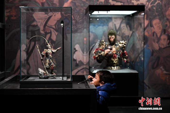 12月31日晚,民众在太原古县城参加“再见上下:黑神话·悟空遇见山西”新年音乐专场跨年活动,迎接即将到来的2026年。图为儿童参观《黑神话·悟空》雕像。中新社记者 韦亮 摄