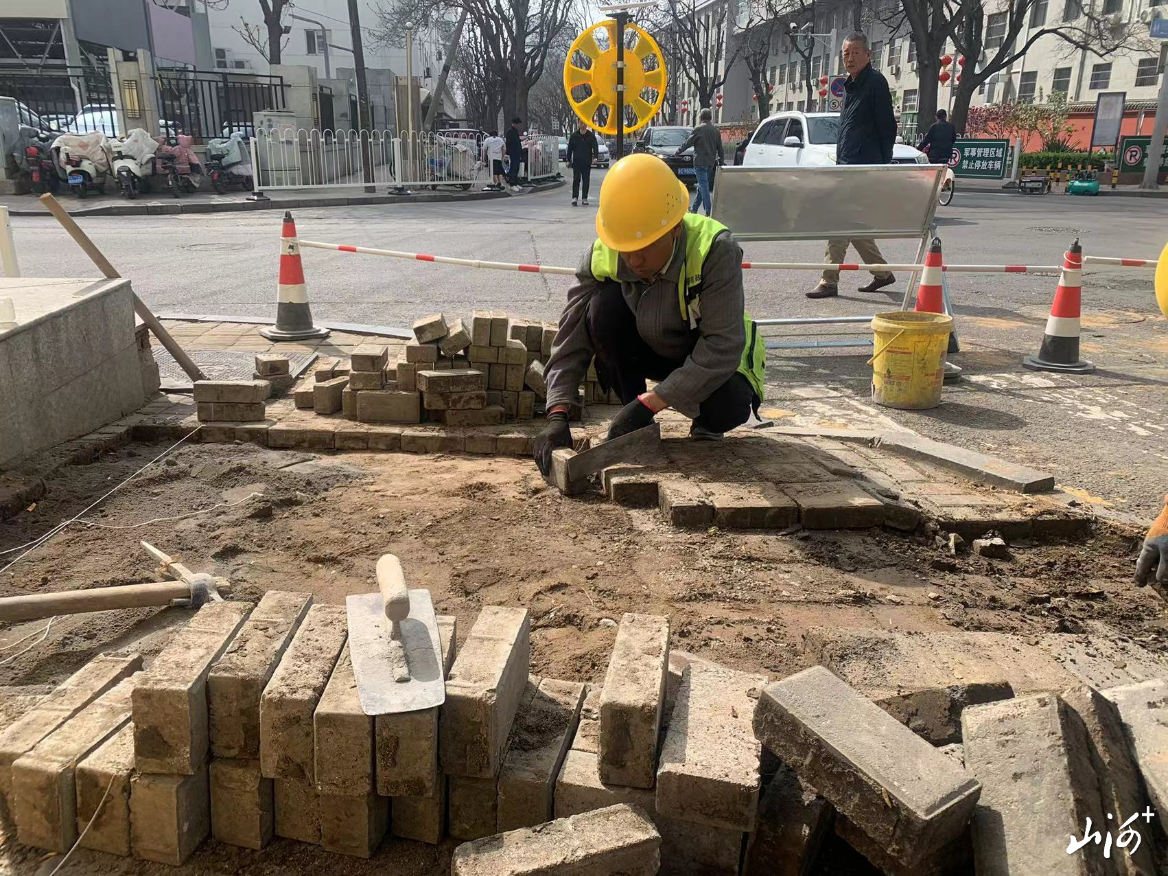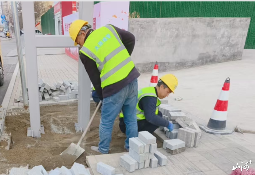 在平阳路、晋阳大道、府西街、小井峪街等路段维修现场,市政部门聚焦前期排查出的突出问题,对便道各类病害以及盲道缺失、破损、被占用、盲点设置不规范等问题展开集中处置。人员穿梭的施工现场,作业人员严格按照施工规范,手拿铁锹、锤子等工具,逐一拆除破损、起翘、下陷的便道砖,对沉降基层进行平整夯实后,重新铺装新的便道砖,确保横平竖直、缝隙均匀;对一些边角及检查井周边的异形区域,使用切割机精准裁切小块砖块,确保铺装严丝合缝、地面平整;铺装完成后,立即撒布细砂进行填缝处理。经过作业人员巧手铺装,人行便道恢复平整畅通。
