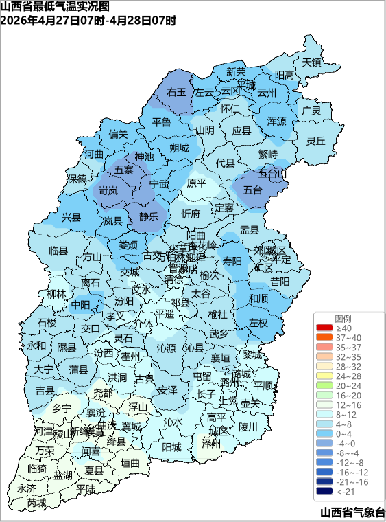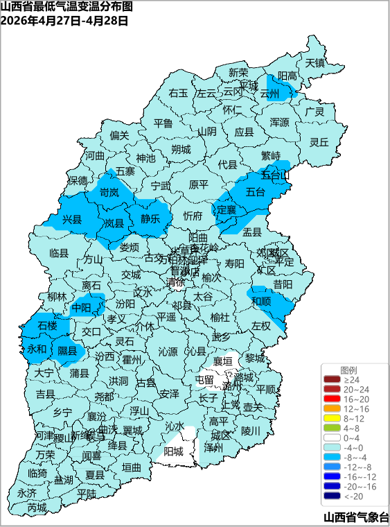 以24小时最低气温降幅统计,截至4月28日07时,大同、阳泉、朔州、晋中、运城、忻州、临汾和吕梁的全域,太原、长治和晋城的大部共113个县(市、区)出现幅度为0.4~6.4℃的降温。其中,岚县、五台、兴县、永和、定襄、和顺、隰县、静乐、岢岚、云州区、中阳、石楼、云冈区共13个县(市、区)在4~8℃之间。