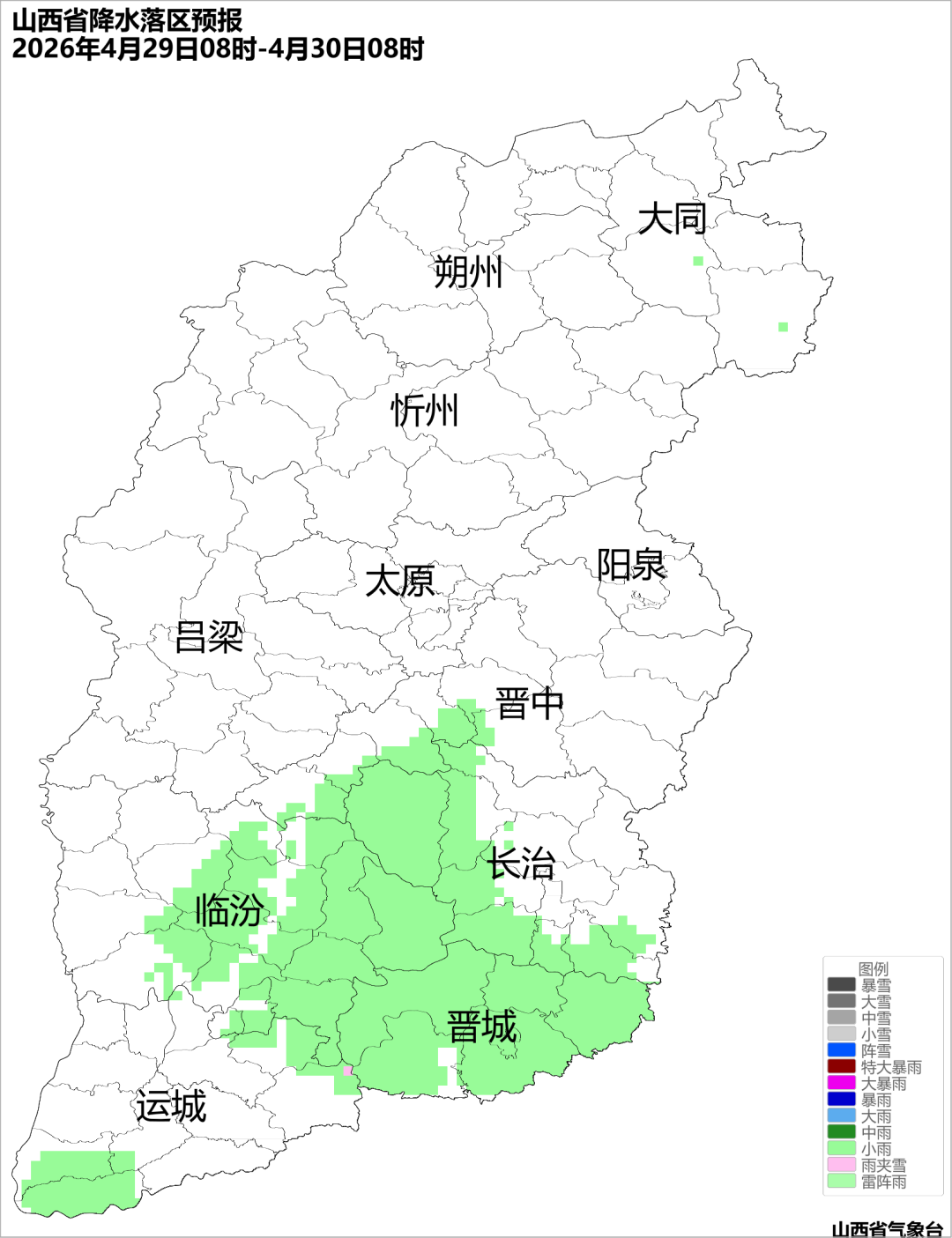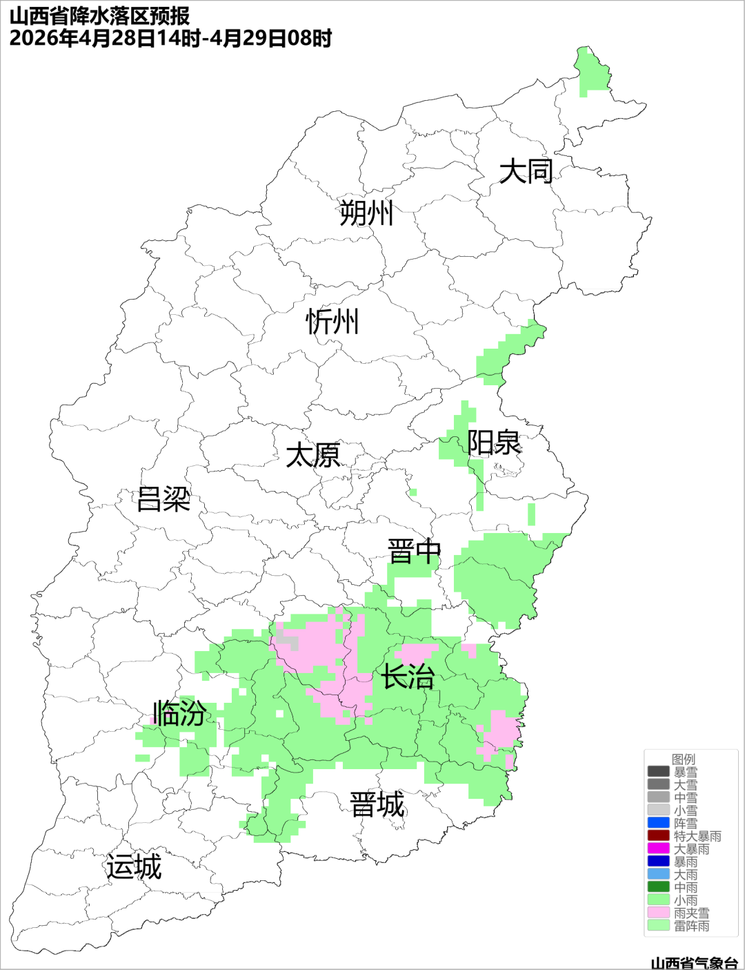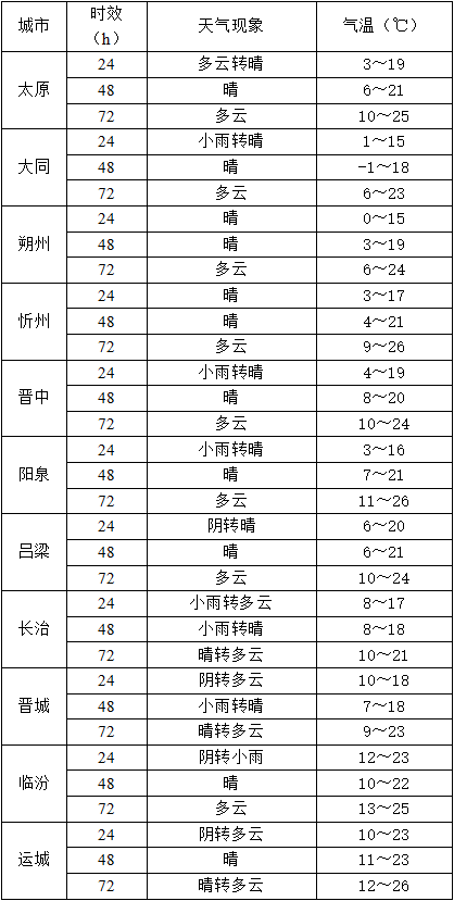 4月27日07时至28日07时,我省各地最高气温介于14.1℃(平鲁区)~27.9℃(霍州)之间。全省各地最低气温介于-0.8℃(右玉)~15.3℃(平陆)之间。朔州和忻州的局部共5个县(市、区)最低气温在0℃以下。