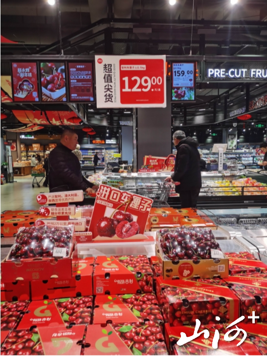 并州路永辉超市内,色泽诱人的智利车厘子陈列得整整齐齐,2J5斤装129元,3J5斤装159元,不时有顾客前来挑选购买。