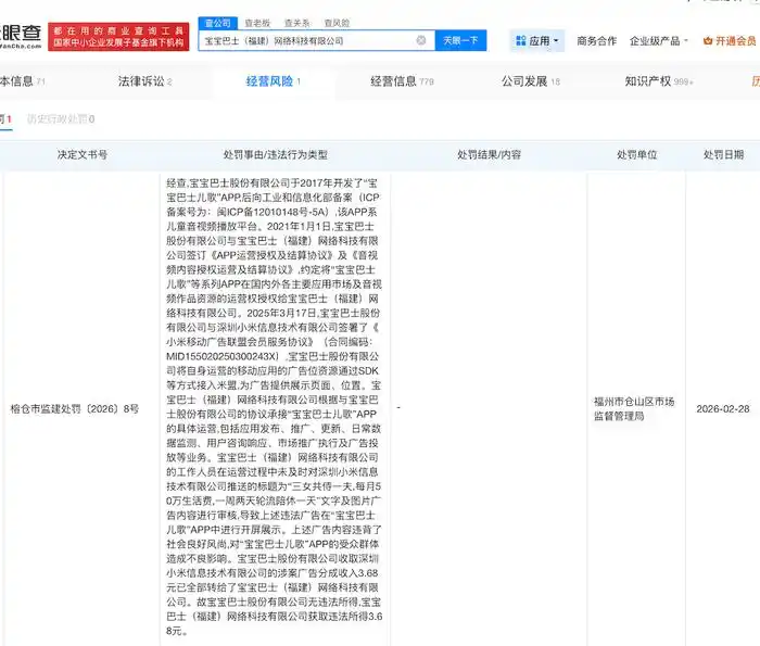 山西晚报·山河+讯 3月17日,山西晚报·山河+记者检索天眼查App发现,宝宝巴士(福建)网络科技有限公司因发布低俗广告,于2月底被福州市仓山区市场监督管理局罚款30万元、没收违法所得3.68元。