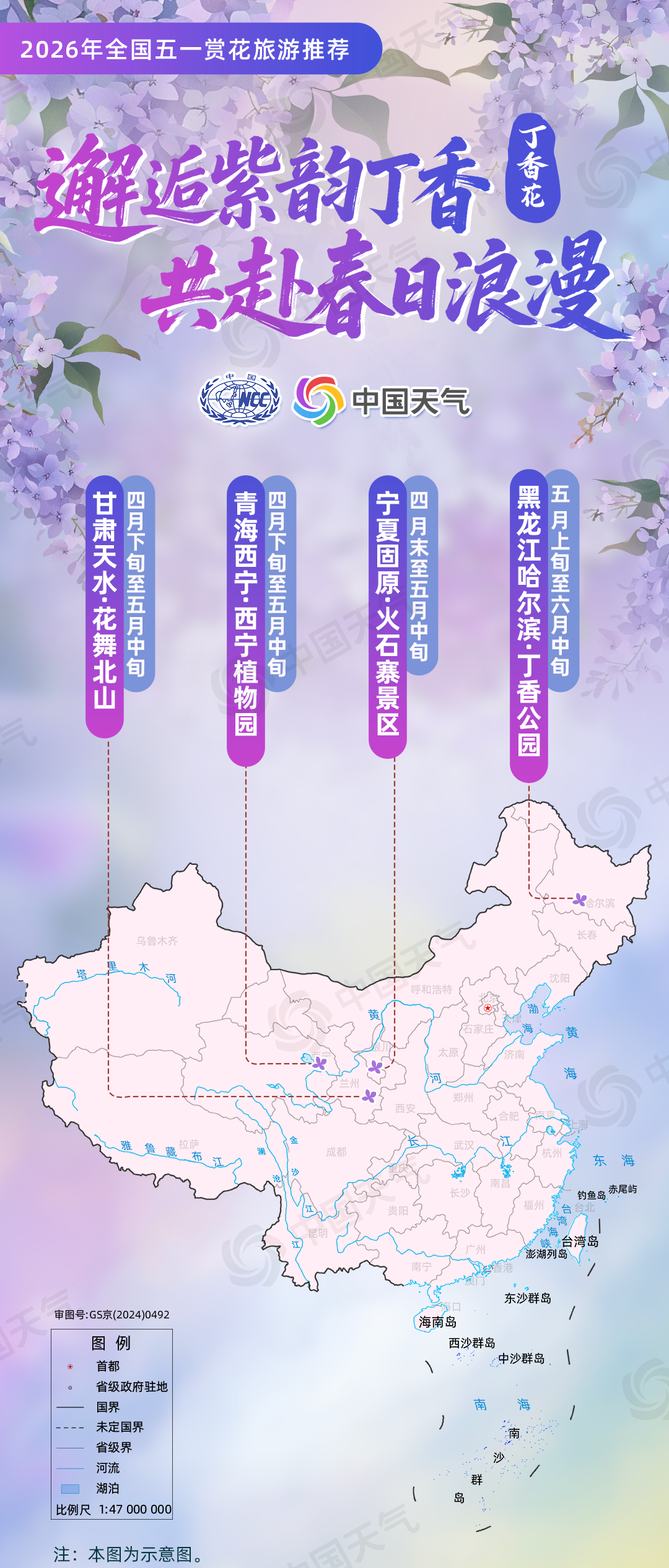丁香花:“邂逅紫韵丁香・共赴春日浪漫”(黑龙江哈尔滨丁香公园、甘肃天水花舞北山、青海西宁植物园、宁夏固原火石寨景区);