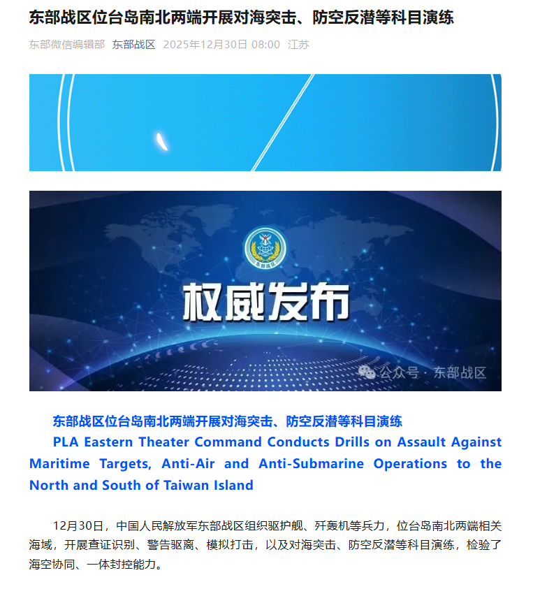 12月30日,中国人民解放军东部战区组织驱护舰、歼轰机等兵力,位台岛南北两端相关海域,开展查证识别、警告驱离、模拟打击,以及对海突击、防空反潜等科目演练,检验了海空协同、一体封控能力。
