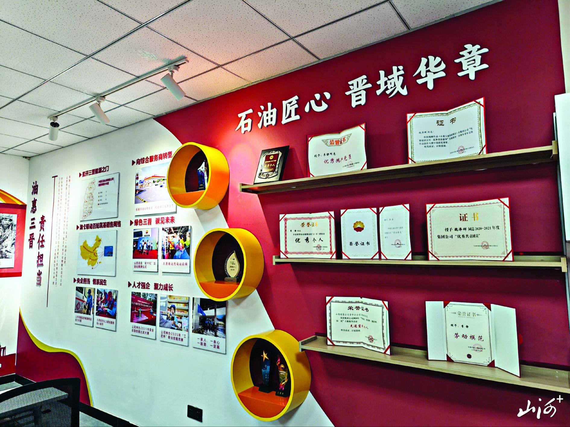 不论是加油站的主外墙上,还是办公楼楼梯间的文化长廊,以及办公区的精神文化墙,每一处都能看到加油站的“灵魂所在”。山西晚报·山河+记者看到,除了晋商“诚实守信、开拓进取、和衷共济、务实经营、经世济民”的二十字精神箴言熠熠生辉,“苦干实干、三老四严”的石油精神与“爱国、创业、求实、奉献”的大庆精神、铁人精神同样格外醒目。两种跨越不同领域与时代的精神,在一幅幅精心布置的展板上或墙面上达成了价值共鸣。