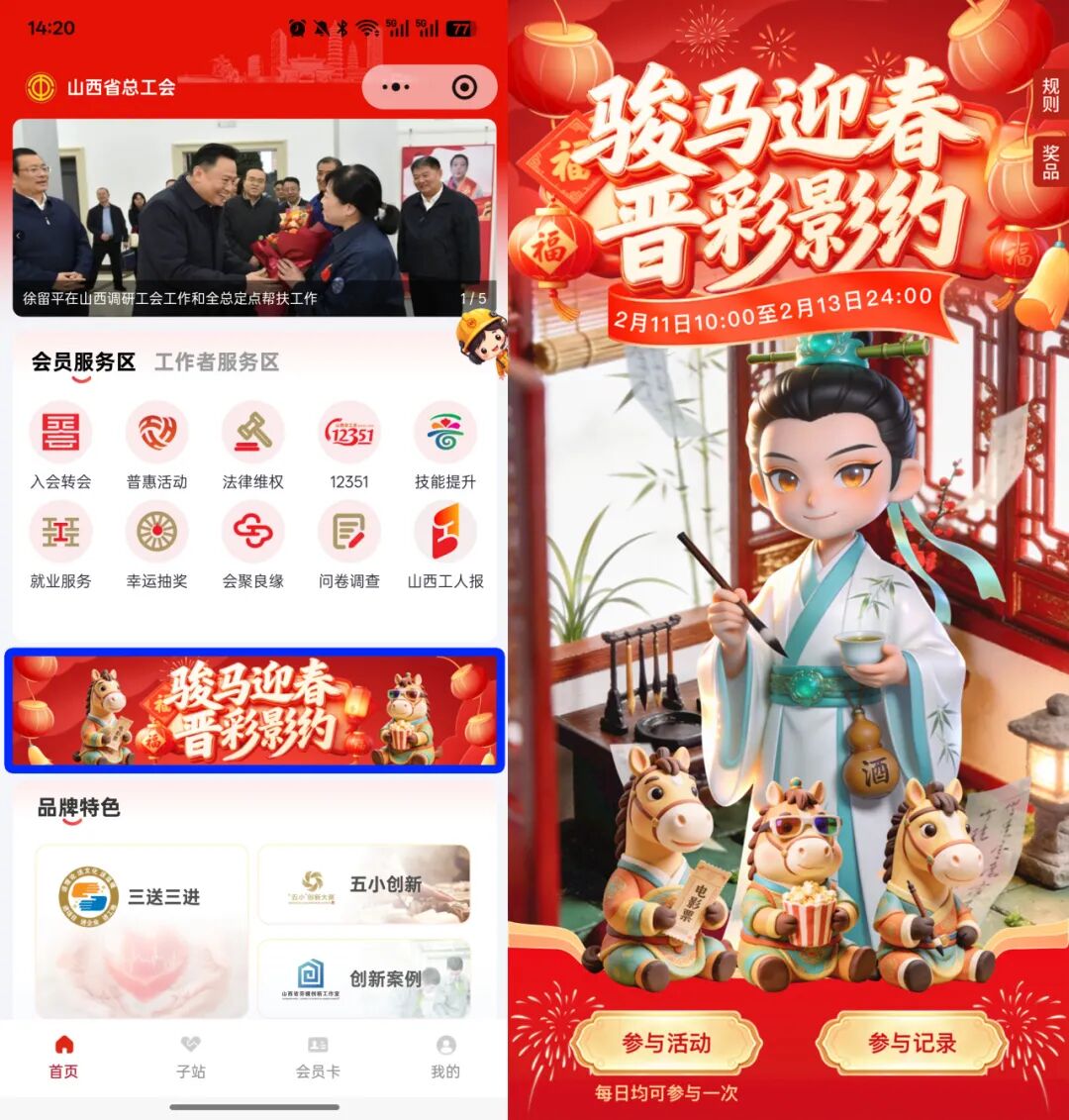 参与活动前,须在“职工晋家”小程序完成实名认证。未认证的工会会员,可在“职工晋家”小程序首页点击【工会会员服务区-入会转会-认证】。认证成功即可参与活动。