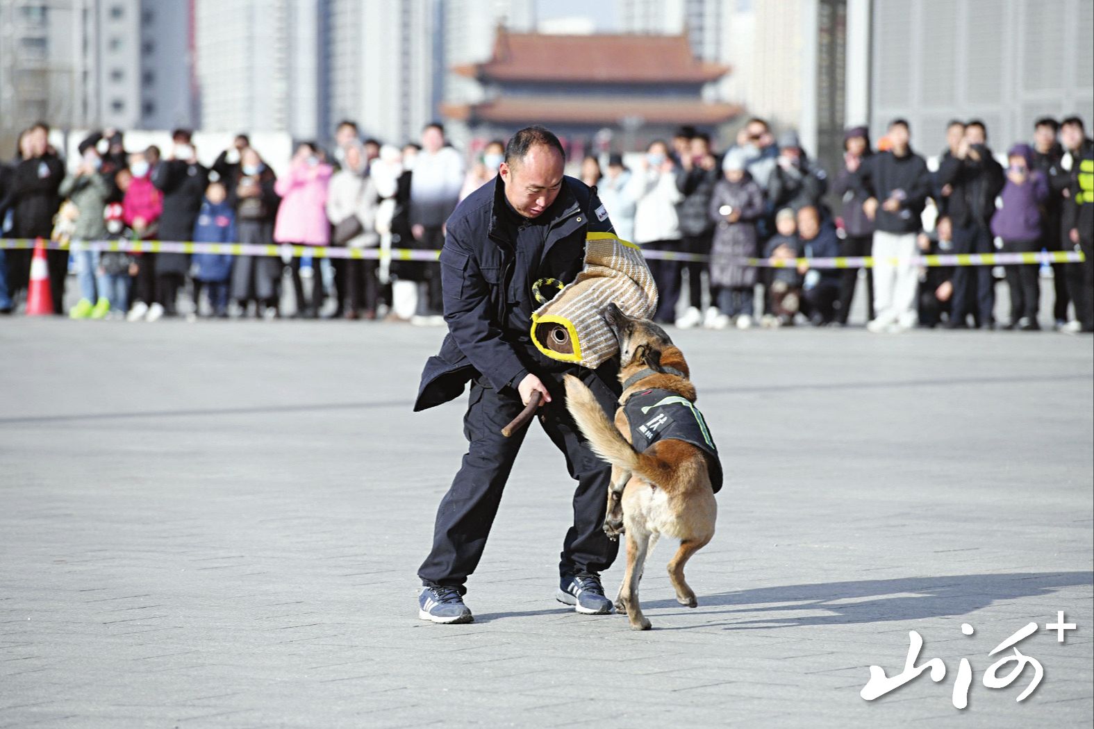 警犬在训导员口令指挥下,完成惊险刺激的扑咬科目。山西晚报·山河+记者 武六红摄