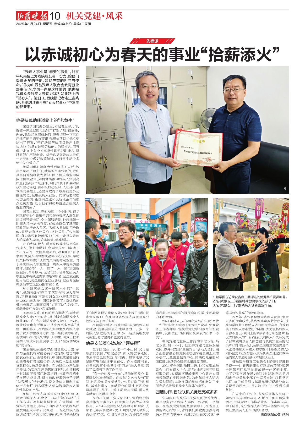 2024年全国助残日当天,他和支部成员联合山西省盲人协会、新韵(山西)国际贸易有限公司、太原滨河果岭康养中心共赴太原市云华爱心庄园敬老院,为老年残疾人送去关爱与温暖,丰富多彩的党建活动激发了支部党员热忱服务残疾人群体的意识。