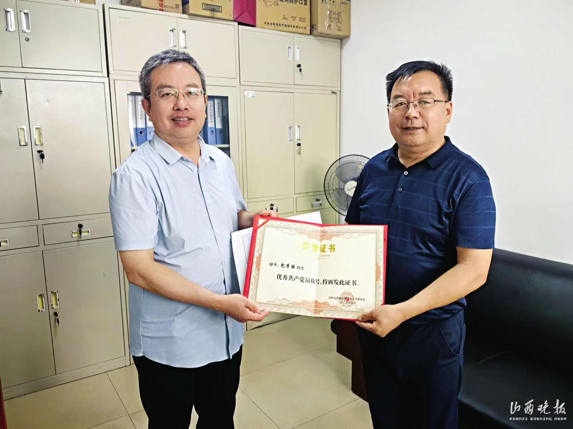 包学国(右)荣获省直工委评选的优秀共产党员称号。