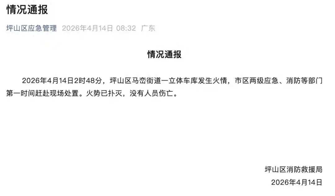 山西晚报·山河+讯 4月14日,多名网友称,深圳比亚迪坪山工厂出现火情。同日上午,深圳坪山区应急管理局通报显示,2026年4月14日2时48分,坪山区马峦街道一立体车库发生火情,市区两级应急、消防等部门第一时间赶赴现场处置。火势已扑灭,没有人员伤亡。
