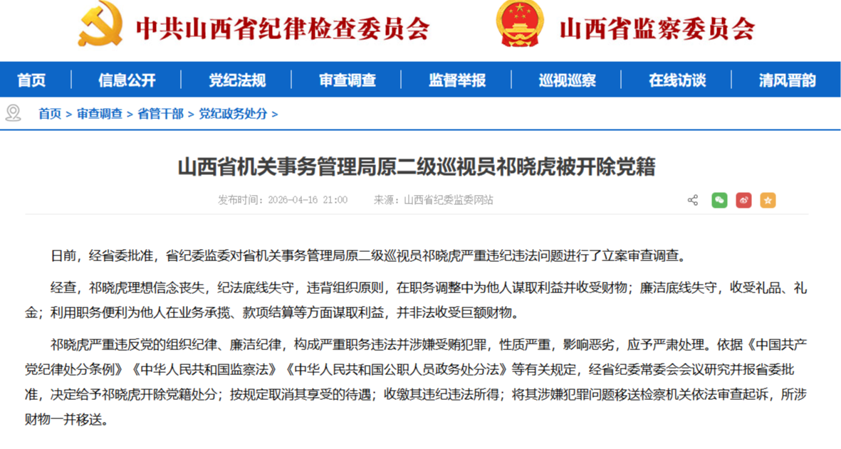 日前,经省委批准,省纪委监委对省机关事务管理局原二级巡视员祁晓虎严重违纪违法问题进行了立案审查调查。