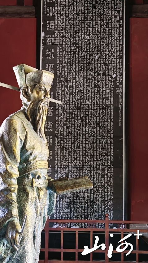 转过碑林,遇见正警枕苦读的司马光。圆木制成的枕头稍一动弹就会滚落,在这里,司马光以圆木为枕,每翻身便惊醒起身,继续编纂《资治通鉴》。导游轻声讲述道:“这块石头,就是他常年放置警枕的地方。警枕十载,编著传奇。”