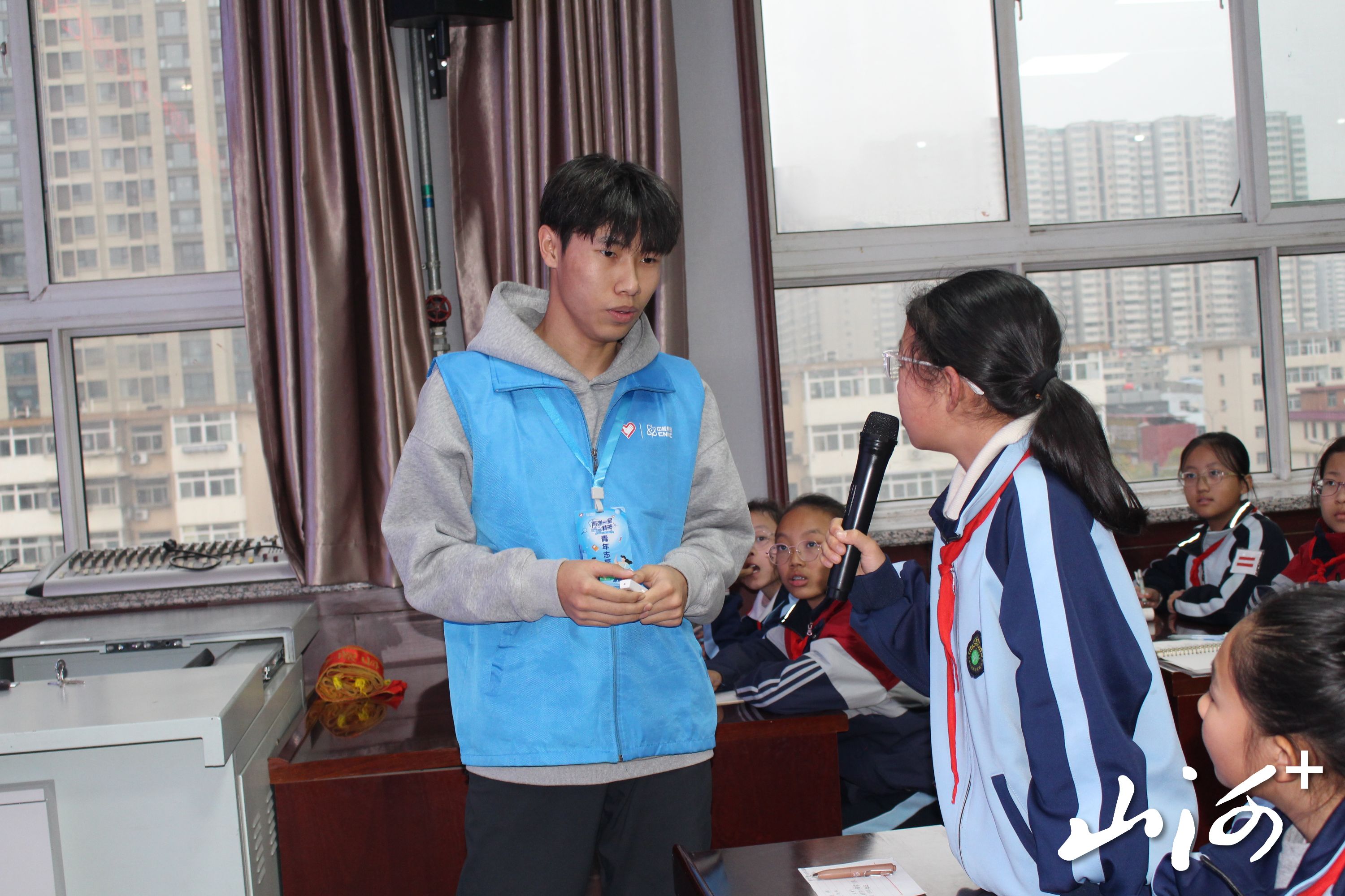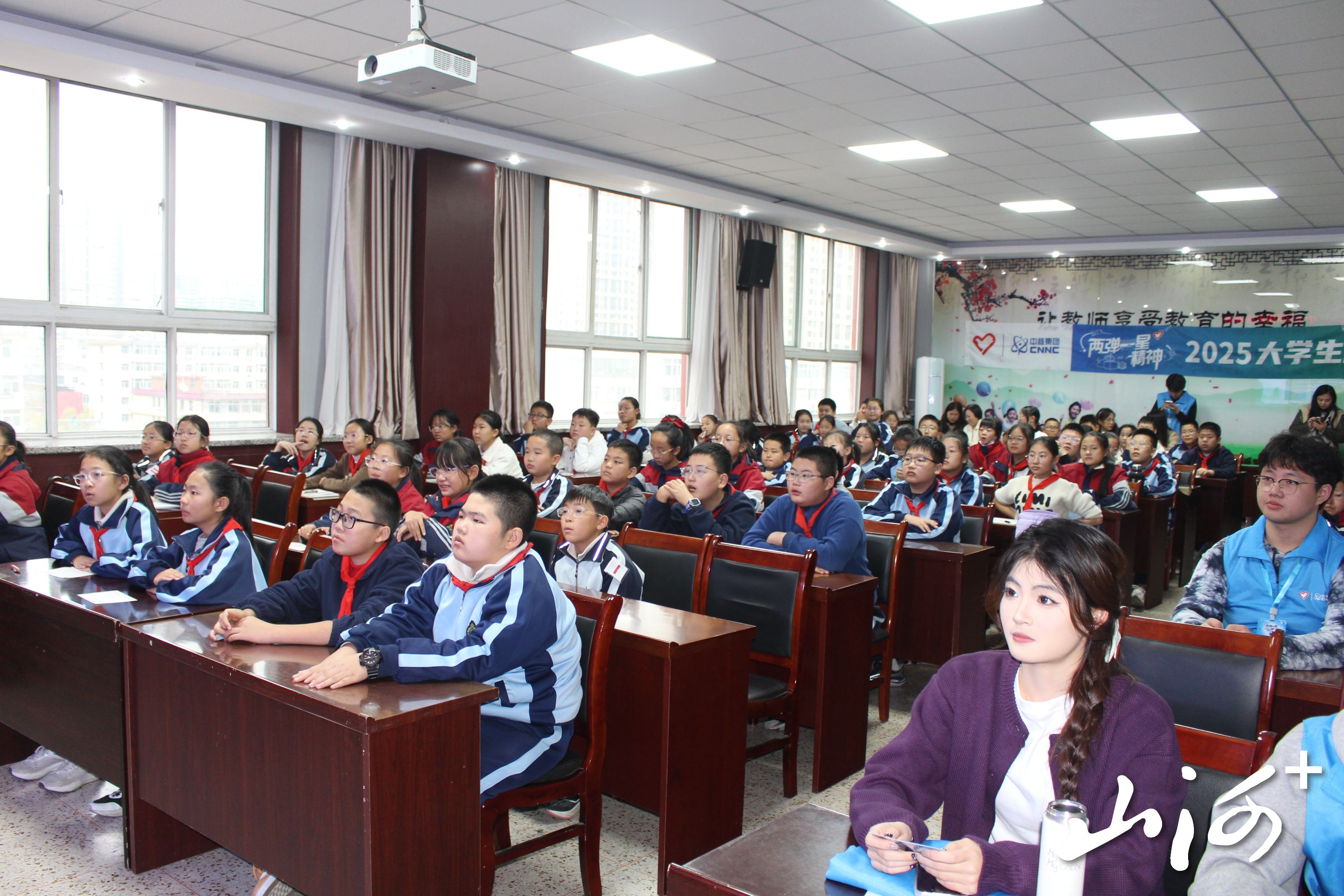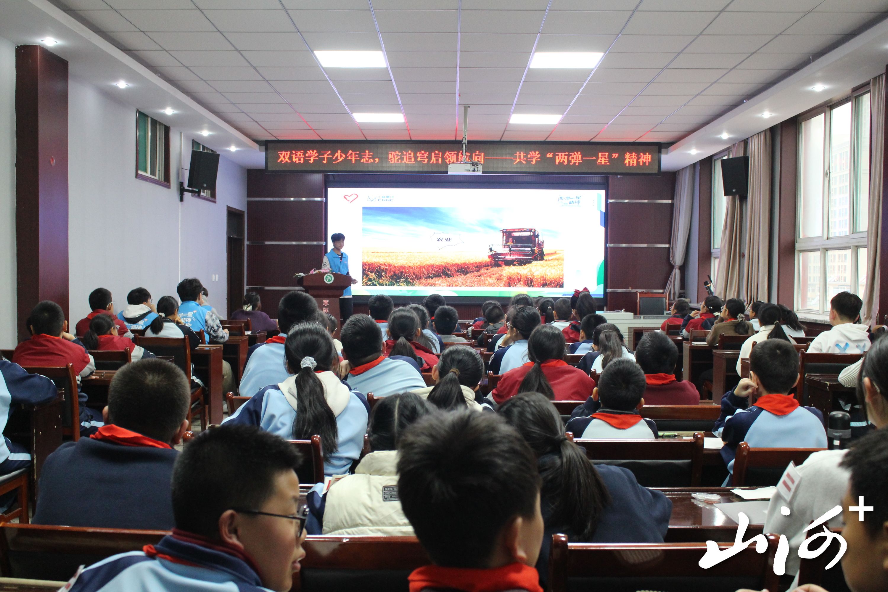 活动伊始,宣讲团成员、尖草坪区双语实验小学优秀毕业生解奕勃,一句“以前我和大家一样在这里上课,现在能以宣讲员身份回来很开心”,让现场氛围迅速升温。解奕勃以“‘两弹一星’功勋获得者有谁”设问,引发孩子们踊跃抢答。