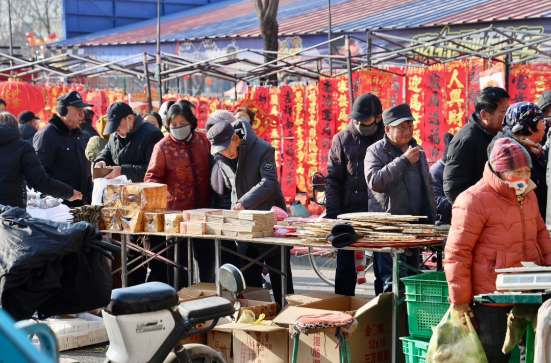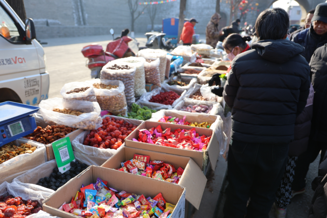 大同云冈区张留庄村的乡村大集,藏着最质朴的乡土年味。天还未亮,村委会门前的空地上就已是人声鼎沸,长长的摊位如游龙蜿蜒,农产品、对联、柿饼糕点等应有尽有。