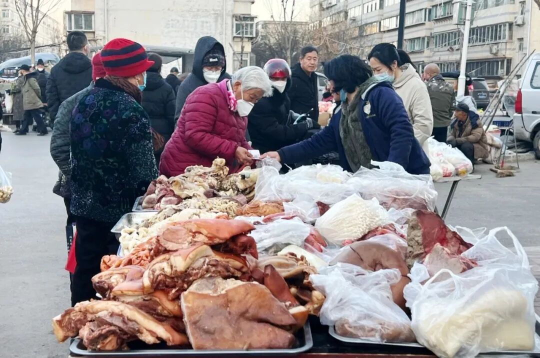 如果说对联彩灯是新年的“氛围感担当”,那新鲜的肉禽蔬果就是年夜饭的“实力主角”。山西人的新年,讲究的是“囤硬货、吃大餐”,而大集,就是一站式搞定年夜大餐的最佳去处,肥美的肉、新鲜的菜、甜滋滋的水果,在这里应有尽有,逛上一圈,年夜饭的餐桌就被安排得明明白白。