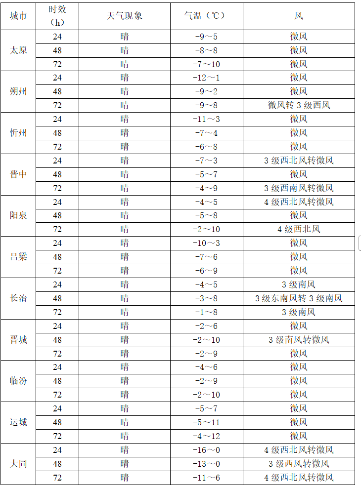 早晚最低:高寒地区-16℃左右,北部及中南部山区-14~-8℃,中南部其余地区-8~-3℃。