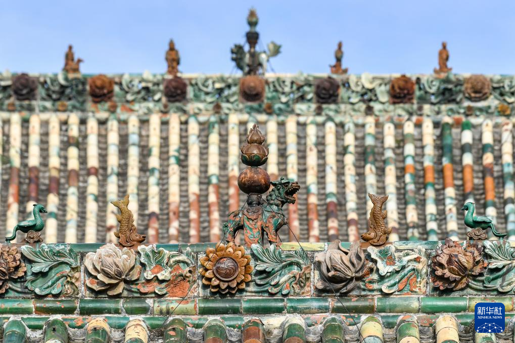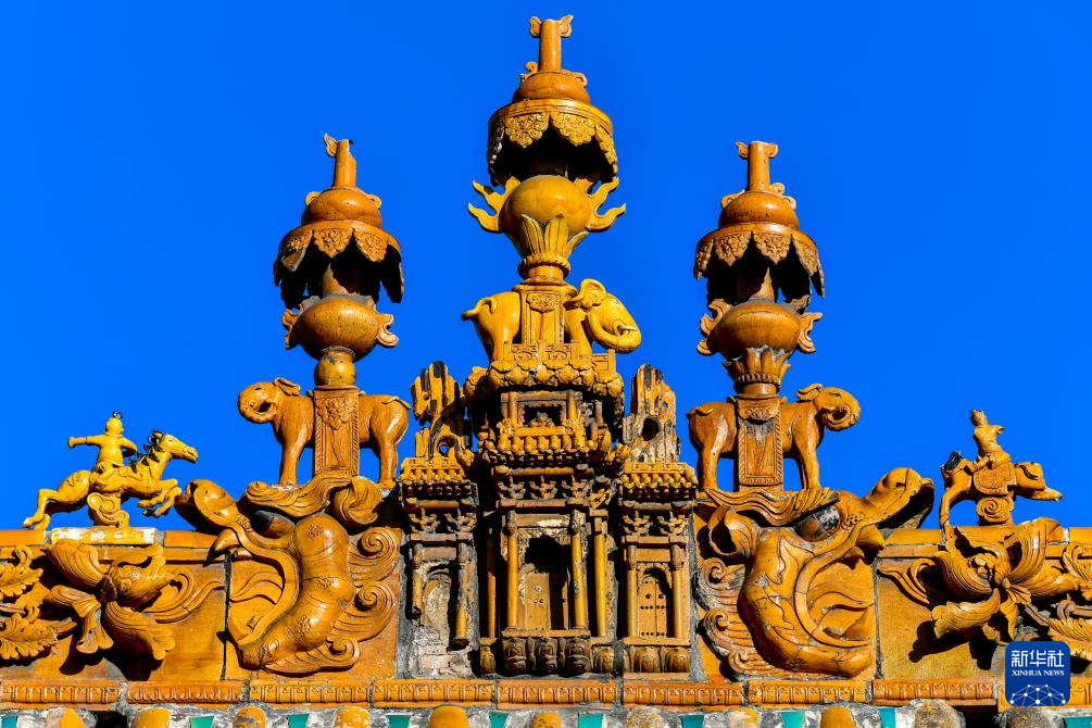 这是11月14日在山西省运城市解州关帝庙拍摄的古建顶上的装饰构件。