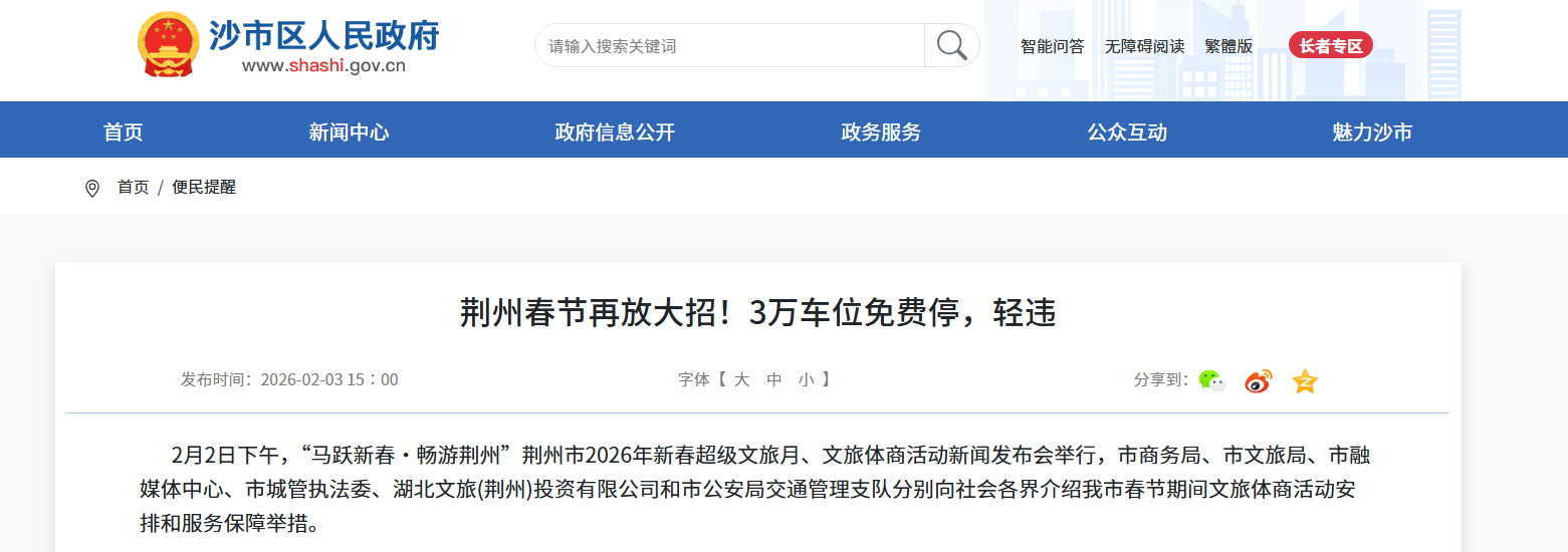据荆州广播电视台官方账号消息,2月2日下午,“马跃新春·畅游荆州”荆州市2026年新春超级文旅月文旅体商活动新闻发布会举行。荆州市城管执法委将全面盘活并释放各类停车资源。春节期间,中心城区所有机关、事业单位内部停车场将向社会免费开放,共计提供8324个泊位。同时,城区内所有道路划线收费泊位及部分社会收费停车场约2.2万个泊位也将同步实行免费停放政策。通过“应免尽免、能开尽开”的原则,届时中心城区免费泊位总量将超过3万个。