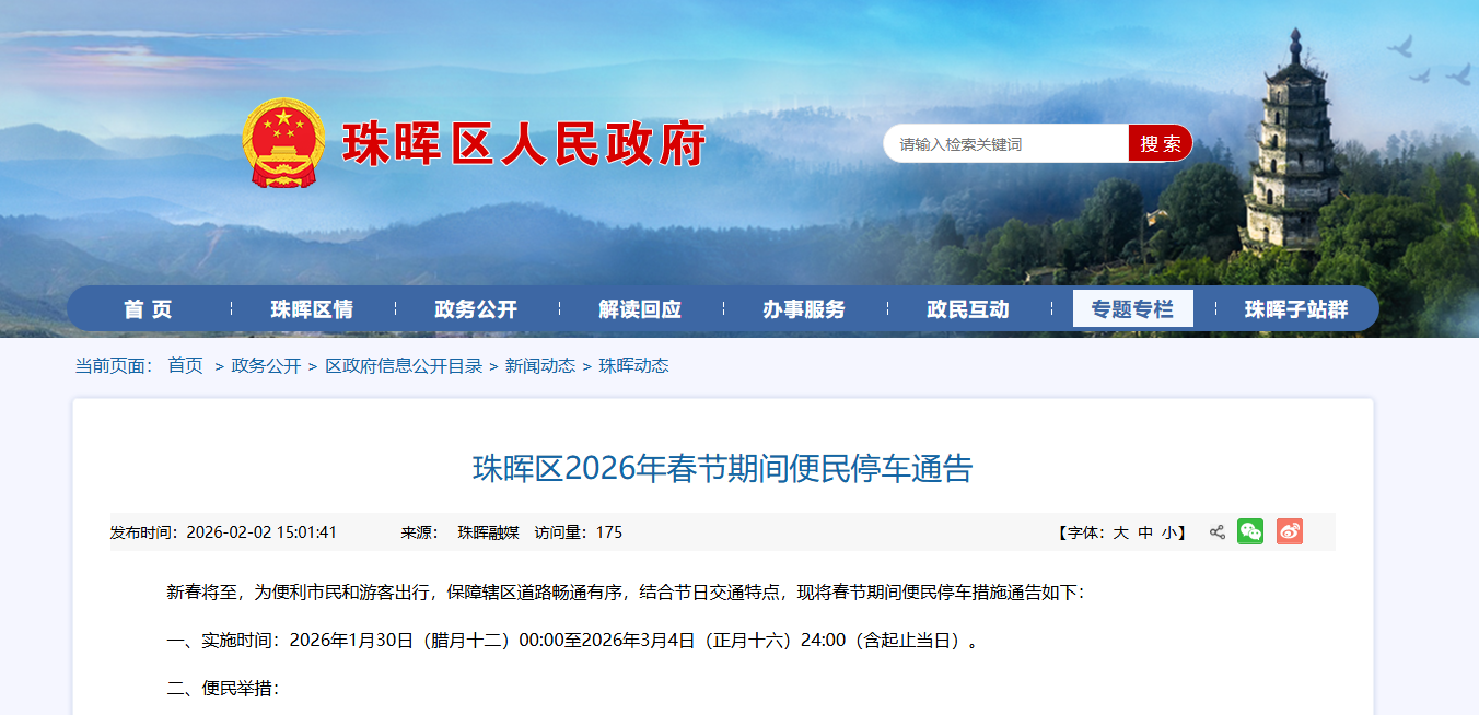 衡阳市珠晖区也发布《2026年春节期间便民停车通告》:2026年1月30日(腊月十二)00:00至2026年3月4日(正月十六)24:00(含起止当日)。全区政府投资建设的公共区域停车场(含城市道路公共泊位、公园广场配套停车场等,不含小区内部停车场、商业综合体专属停车场)、机关事业单位停车场(涉密及特殊安保需求单位除外,相关单位需提前在出入口显著位置公示不开放说明),实施期间免费向社会开放。