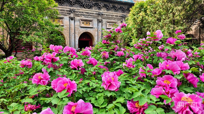 永祚寺内的牡丹远不止“紫霞仙”一枝独秀。据了解,寺内牡丹占地30余亩,共有8000余株、100多个品种,粉、红、黄、白、紫、绿、墨、蓝、复色,九色齐全。以明代牡丹“紫霞仙”为代表的各色牡丹珍品,与永祚寺内文物建筑、石碑石刻等共同承载着悠久历史传统,是兼具文化内涵与象征意义的“活文物”。