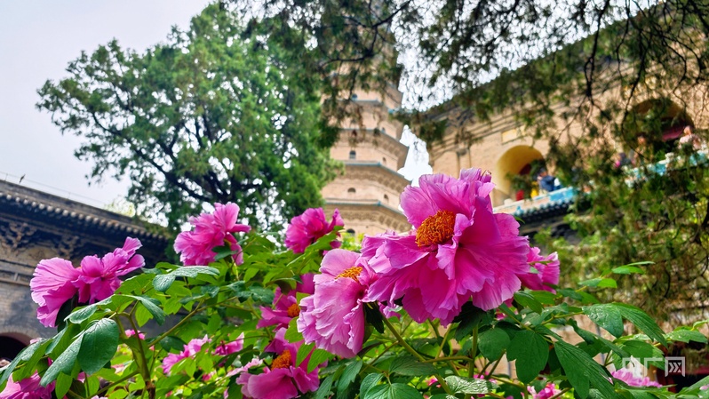 正是这套科学完善的养护体系,让“紫霞仙”健康绽放、代代相传。春日古刹,双塔巍峨对峙,游客在欣赏牡丹时,不仅能嗅到其浓香型花香的独特香气,更能抬头仰望巍峨的宣文塔与文峰塔,在花香古影间感受千年龙城的春日韵味。