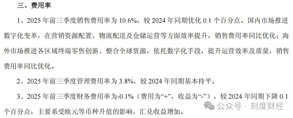 然而,在高光数据的背后,增长动能的隐忧同样不容忽视。营收较美的13.9%的增速仍有差距,且第三季度单季营收增速9.51%,较前三季度整体增速9.98%,略有回落。海尔智家盈利增长的背后,除了产品结构升级,也离不开费用端的优化,前三季度销售费用率10.6%,同比优化0.1个百分点,太平洋证券数据显示,2025年第三季度销售费用率同比下降3.36%。