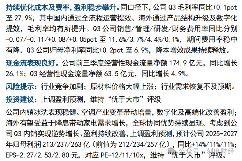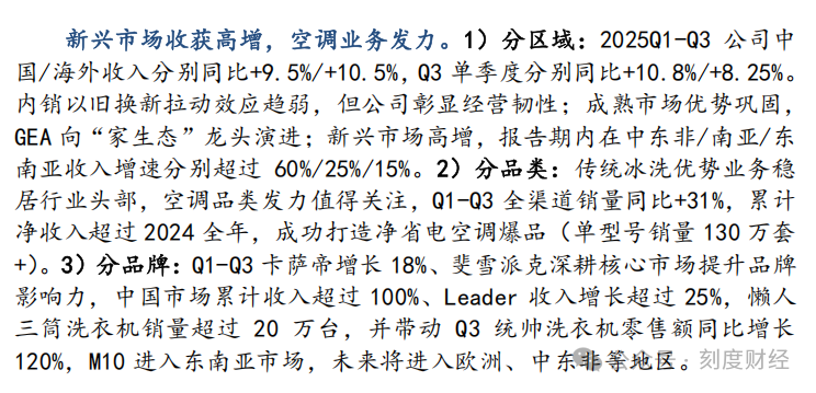 冰洗传统优势业务稳居行业头部,空调业务成为新增长引擎,前三季度全渠道销量同比增长31%,净收入超过2024年全年。
