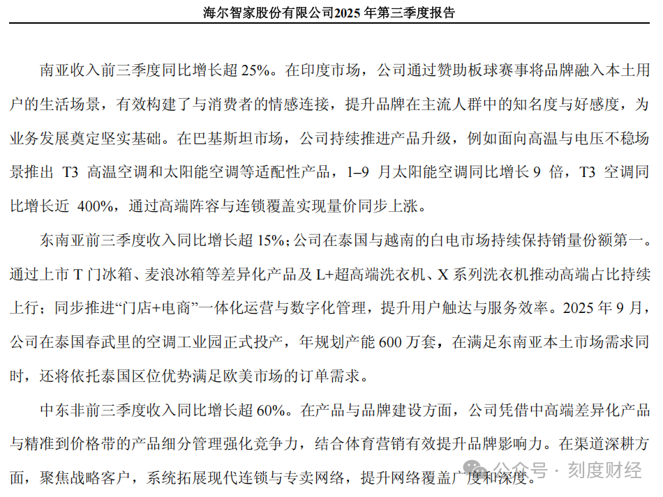 区域表现呈现“成熟市场稳增,新兴市场爆发”的格局,欧洲暖通业务第三季度增长超30%,599欧元以上高端洗衣机销量占比提升至25%,北美GEA向“家生态”演进,优势持续巩固;中东非市场增长60%,南亚增长25%,东南亚增长15%,新兴市场的结构性机遇为增长提供了额外动力。