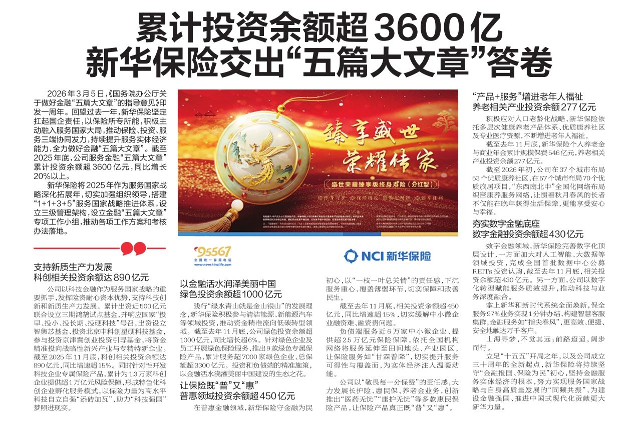 2026年3月5日,《国务院办公厅关于做好金融“五篇大文章”的指导意见》印发一周年。回望过去一年,新华保险坚定扛起国企责任,以保险所专所能,积极主动融入服务国家大局,推动保险、投资、服务三端协同发力,持续提升服务实体经济能力,全力做好金融“五篇大文章”。截至2025年底,公司服务金融“五篇大文章”累计投资余额超3600亿元,同比增长20%以上。