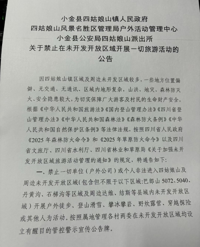 今年9月,小金县四姑娘山镇人民政府、四姑娘山风景名胜区管理局户外活动管理中心、小金县公安局四姑娘山派出所等单位联合发布《关于禁止在未开发开放区域开展一切旅游活动的公告》称,因四姑娘山镇区域及周边未开发区域较多,一些地方位置偏僻、无交通、无通讯、区域内地形复杂,山洪、地灾、森林防灭火、安全隐患较大,为切实保障广大游客及村民的生命财产安全,特通告,禁止一切单位(户外公司)或个人非法进入四姑娘山及周边未开发开放区域开展户外徒步、登山滑雪、攀冰攀岩、野炊或其他人为活动。