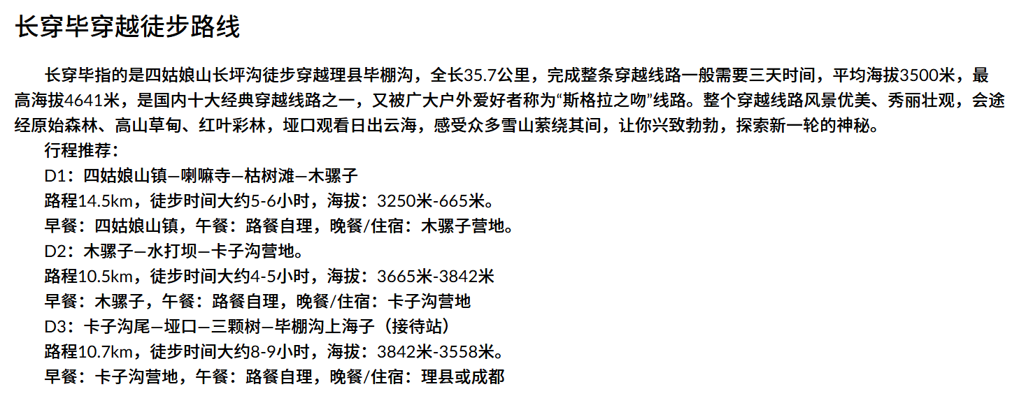 四姑娘山风景名胜区管理局官网显示,长穿毕穿越路线,指的是四姑娘山长坪沟徒步穿越理县毕棚沟,全长35.7公里,完成整条穿越线路一般需要3天时间,平均海拔3500米,最高海拔4641米,是国内十大经典穿越线路之一,又被广大户外爱好者称为“斯格拉之吻”线路。