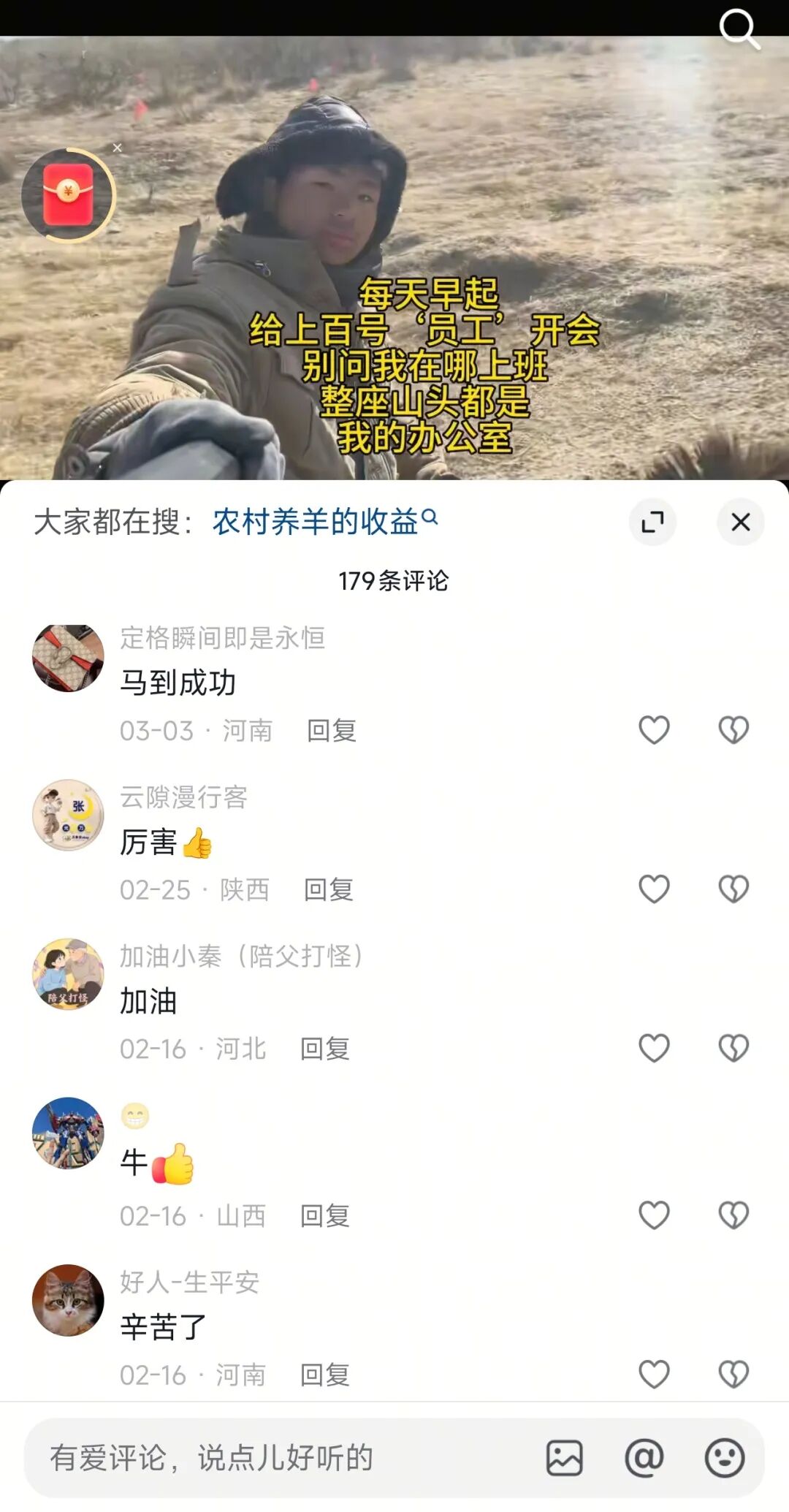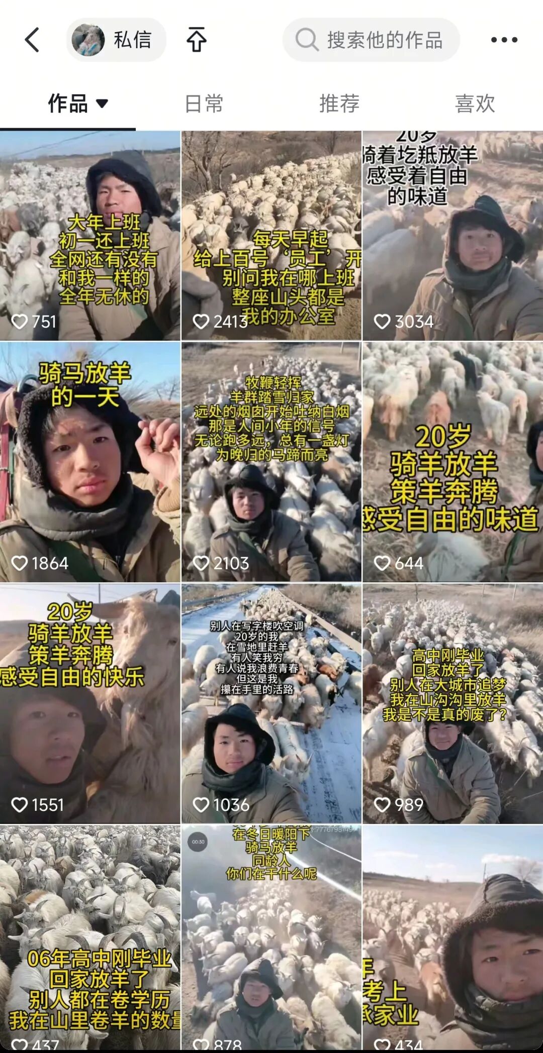 “我们村只有7户人家,4户靠养羊为生。我们家养了500多只绒山羊,每年5月剪羊绒、12月卖羊肉,是家里主要的经济来源。”喻子豪说,高考落榜后,他曾在市里干过快递分拣员、餐厅服务员。去年9月,他开始和父亲牧羊,并在抖音开设账号,用短视频记录日常。