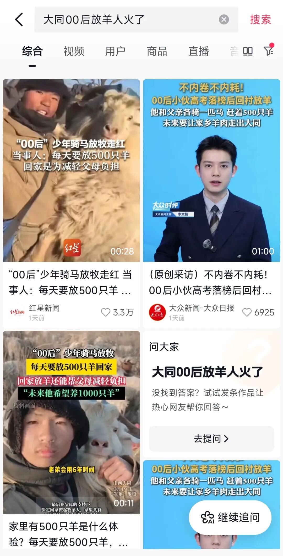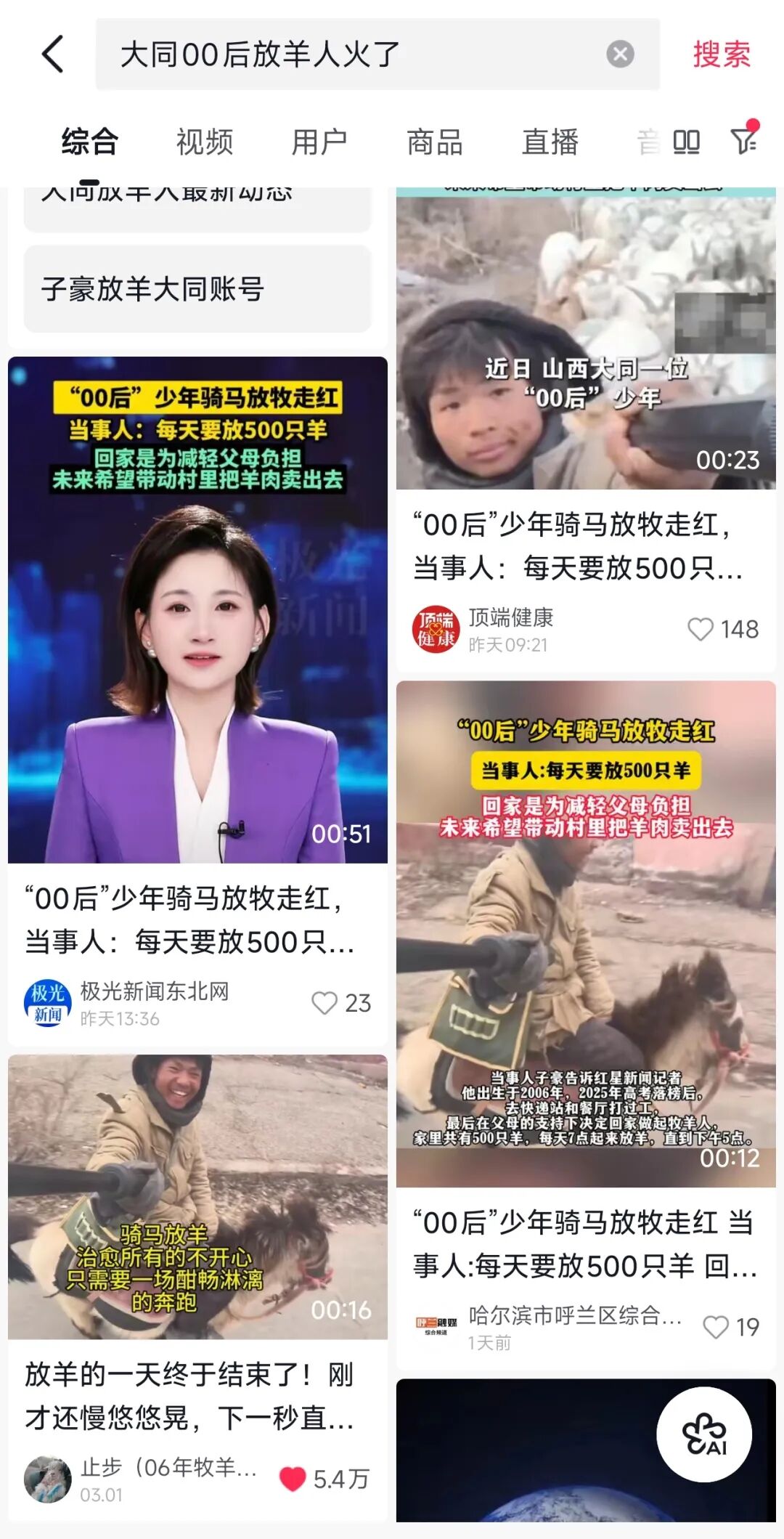 近日,20岁的左云小伙喻子豪返乡牧羊的日常视频走红网络。半年多时间里,他发布100多条视频,收获7.6万粉丝,总浏览量超过6000万。从高考落榜、返乡放羊到直播出圈,这位青年的朴素选择,诠释了“条条大路通罗马”。