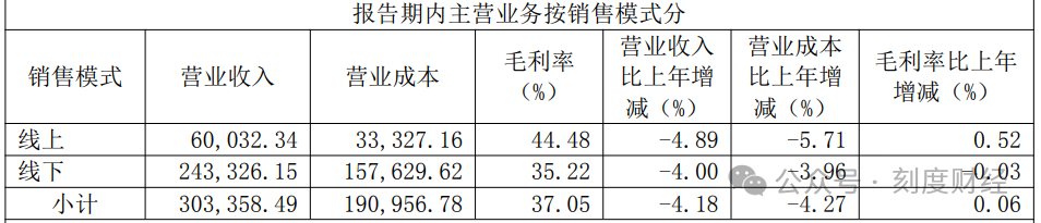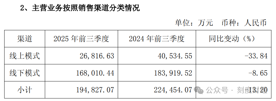 今年前三季度,作为绝对主力的线下渠道实现收入16.80亿元,同比下滑8.65%。线上的销售更显疲软,收入为2.68亿元,同比下滑33.84%。