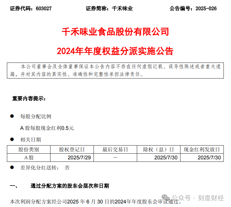 公告显示,经6月30日的2024年年度股东会审议通过,千禾味业拟以总股本10.25亿股为基数,每股派发现金红利0.5元(含税),共计派发现金红利5.13亿元,股权登记日为7月29日。