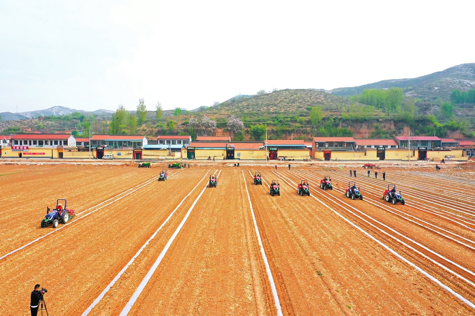 黎城县玉米制种基地上,农机进行旋耕、开沟、覆膜作业。