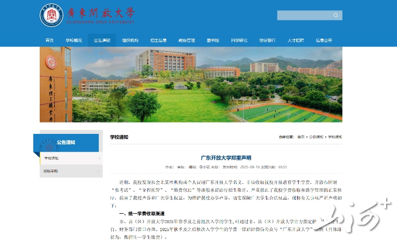 山西晚报·山河+讯 近日,有诈骗机构散布“免考试”“全程托管”“缴费包过”等虚假招生信息,冒用广东开放大学名义欺诈考生。8月16日,广东开放大学官网发布声明:此类承诺均为诈骗。