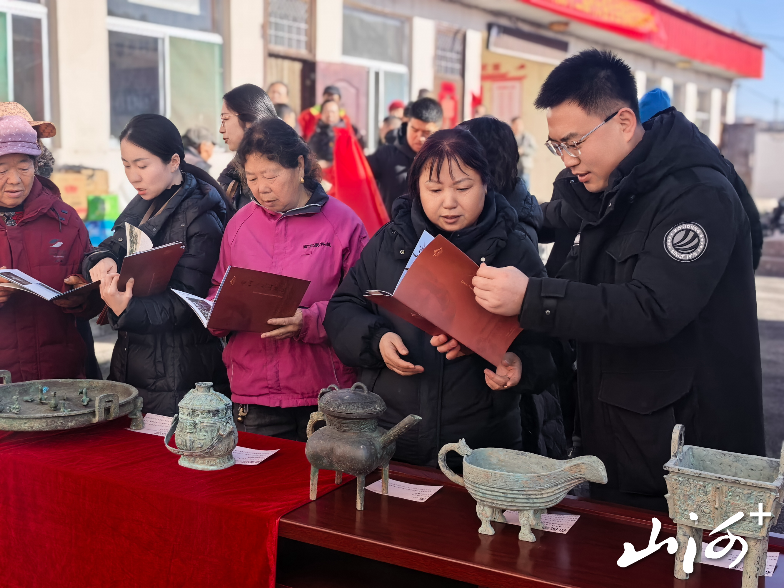 活动特别设置了实物展示与互动讲解环节。现场通过展示叔虞方鼎、赵卿鸟尊等,为村民们详细解读了各类青铜器的历史背景、造型特点与纹饰演变。